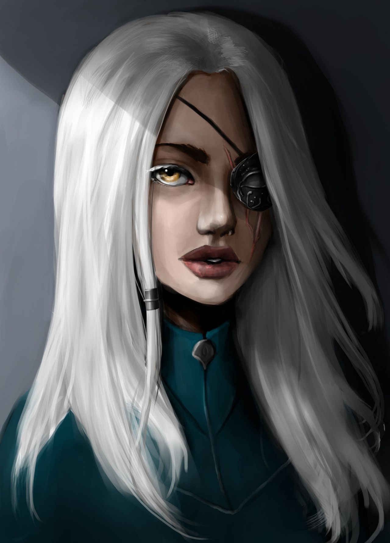 After surviving the blood fever, Adelina's black hair turned silver and her lashes pale. She has dark olive skin, also described to be a warm brown. Adelina also gained a jagged scar where her left eye used to be, as a doctor had to remove it when she was sick with the blood fever. She was said to be very beautiful before the blood fever. One of her fingers was broken by her father, Martino Amouteru, to force out any hidden powers, but none came out.