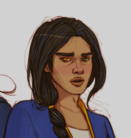 Raffaele is said to be a very beautiful person, people often falling in love with him on sight. He is described as, "one kissed by moon and water," which is an old saying describing those with amazing beauty. He has long, shining black hair with sapphire strands, flawless glowing olive skin, and is described as tall and fit. His markings from the Blood Fever are his eyes and hair. Several strands of his hair sapphire blue and his eyes are two different colors. One is a honey color, and the other is green as an emerald. His eyelashes are very long as well and he walks in a graceful manner.